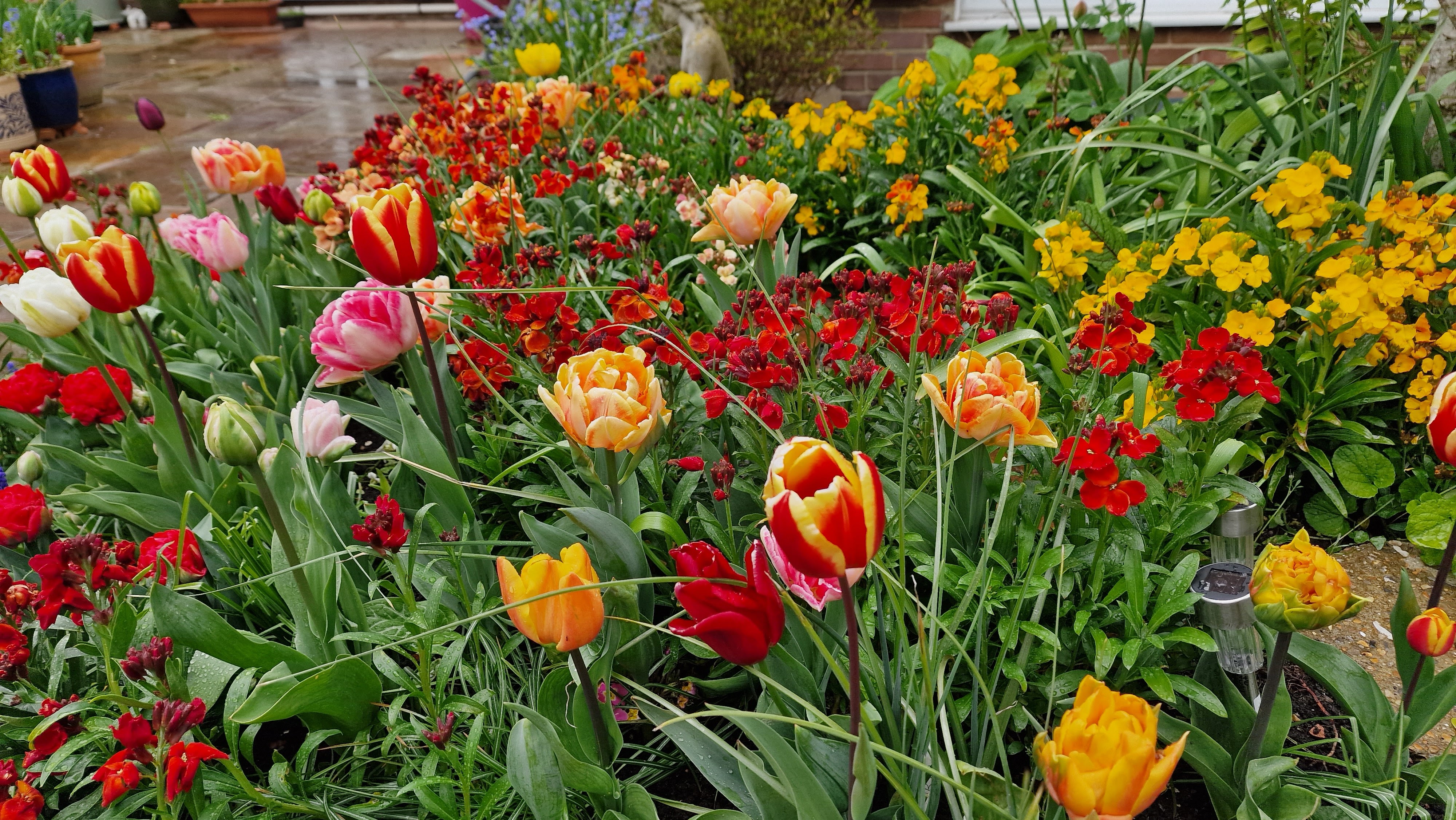 At home the tulips are in their full glory with an undercarpet of wallflowers. I hope they haven`t been ruined by the hailstones this evening.