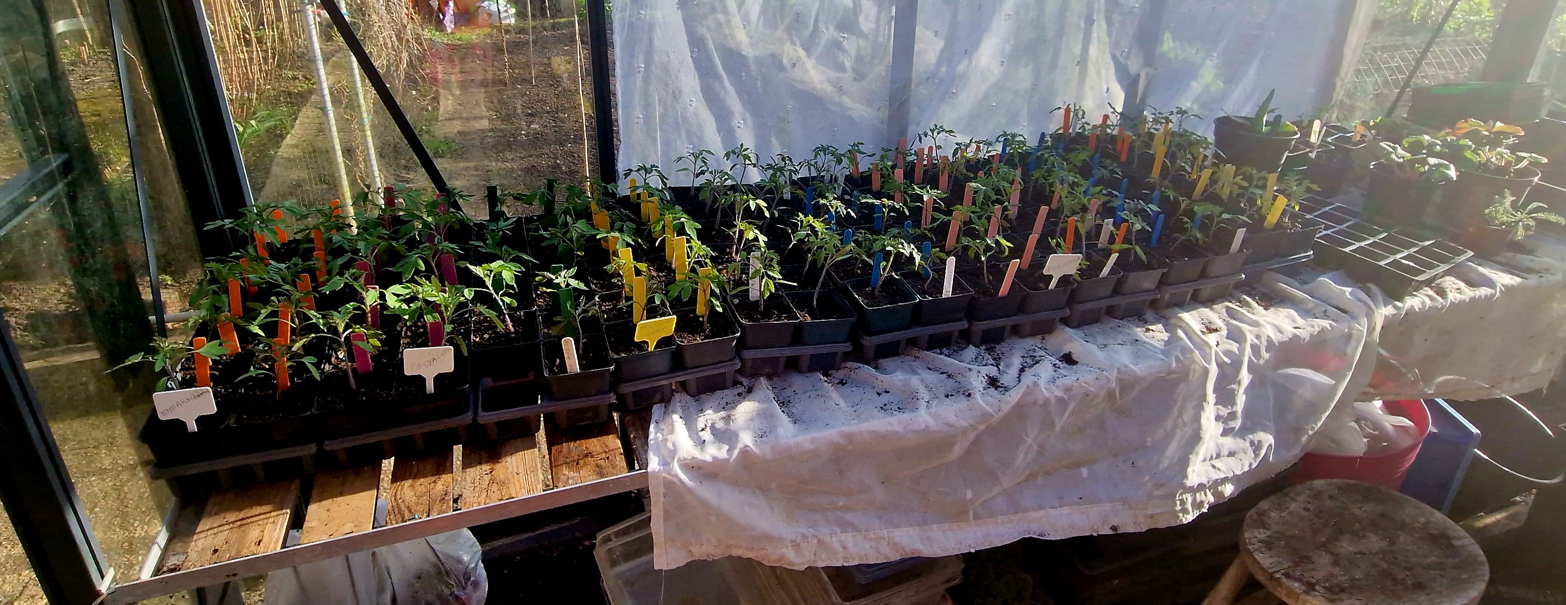 At home I repotted the tomatoes this afternoon. There`s quite a few. I already have the first request for 12.